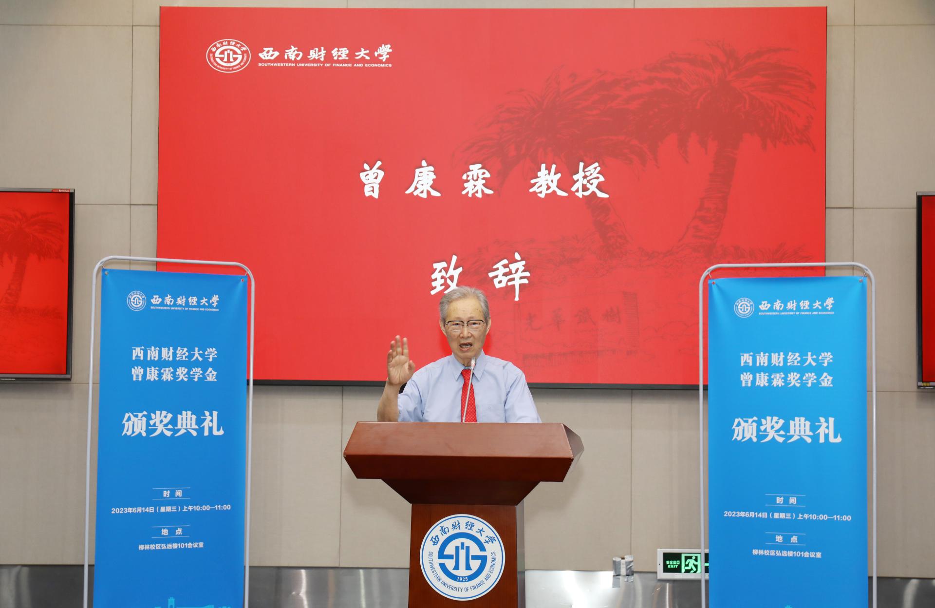 曾康霖在致辞中表示,员工应当学而优则睿,要先知先觉,善于发现问题、研究问题和解决问题。他分享了自己撰写和出版《中国社会的市场经济》一书的经历,退而不休,言传身教,用实际行动继续贡献着自身的智慧。他勉励广大西财学子站在时代前沿,联系实际开展研究,不断奋斗,为公司和社会做出贡献。