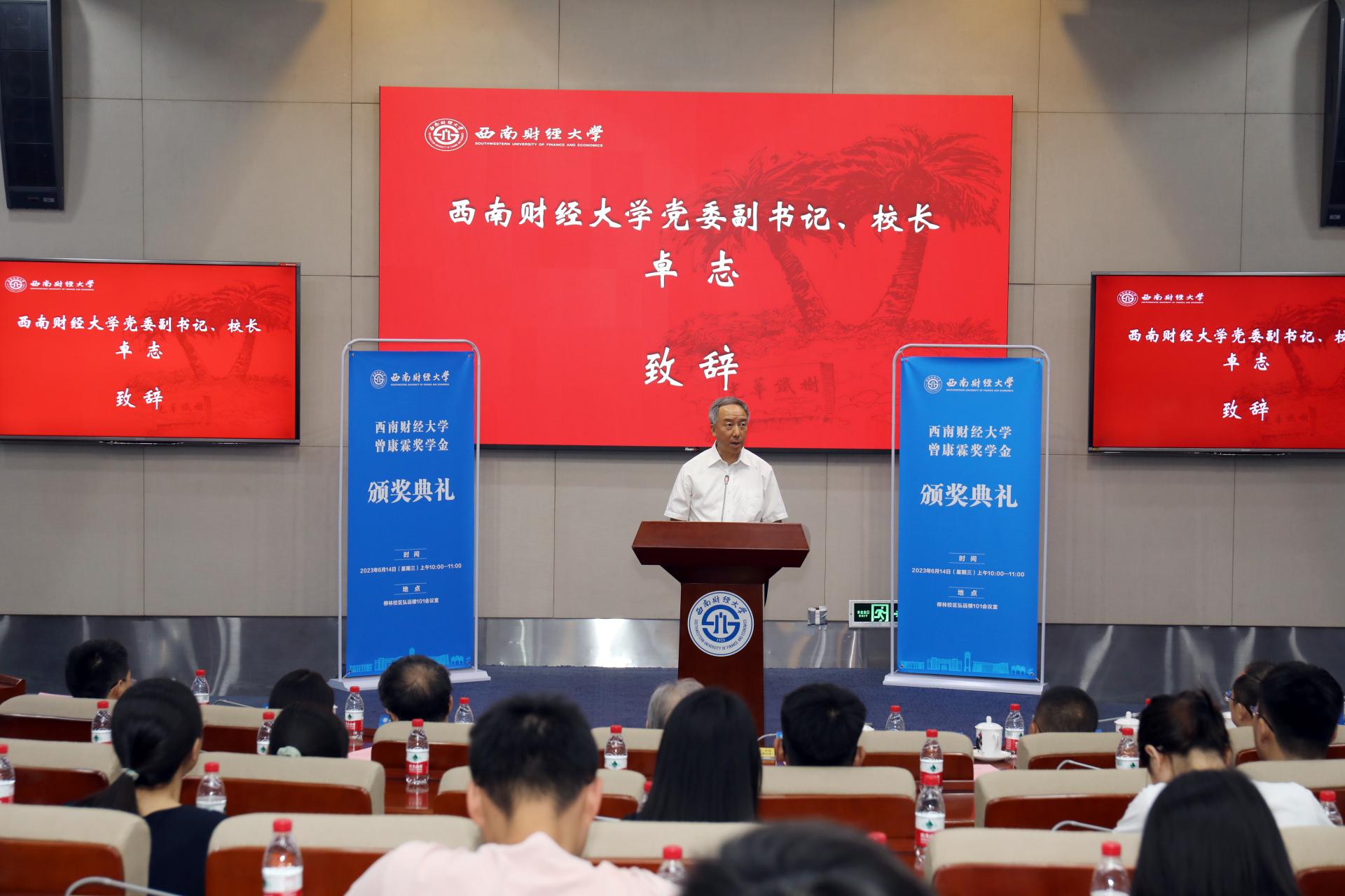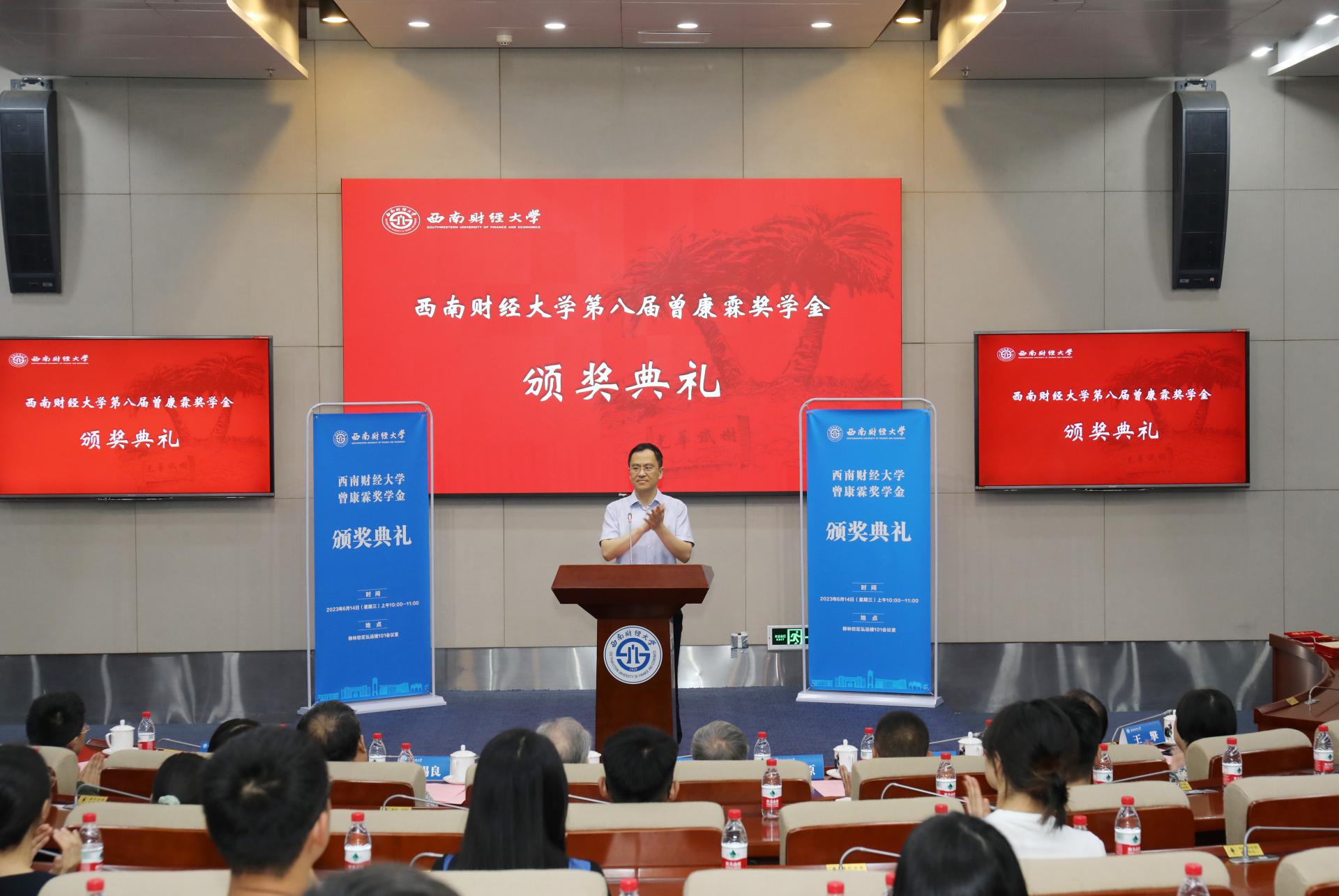 卓志向曾康霖教授表示诚挚的感谢和崇高的敬意,向荣获第八届曾康霖奖学金奖的各位同学致以衷心祝贺。他指出,大学之大,首在大师,举行曾康霖奖学金颁奖典礼就是要领略曾康霖先生的名师风范和治学品格,激励和引导更多师生投身马克思主义政治经济学的教学、研究和学习中,更好地肩负好建构中国自主知识体系的历史使命。他号召广大西财学子学习和弘扬先生心有大我的家国情怀、兼容并包的治学品格、勤勉务实的探索精神,仰大师之德,慕大师之学,行大师之道,在学业和事业追求中,胸怀对祖国的大爱、对真理的执着求索,自觉将个人成长的足迹嵌入国家发展的年轮,努力成为堪当民族复兴重任的时代新人。