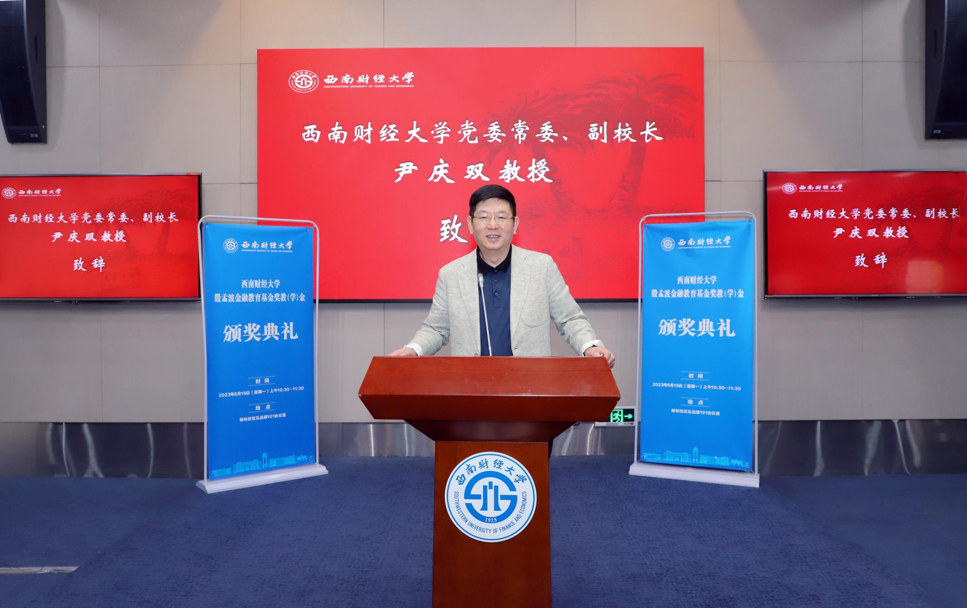 尹庆双介绍了殷孟波基金会的建立与发展,并代表公司对殷孟波及员工对公司金融学科教育事业的贡献致以崇高谢意,向获得本次奖教金的师生致以衷心祝贺。他从加大宣传力度、建立获奖师生与殷孟波教授的沟通机制等方面对基金会的未来工作提出了宝贵意见。