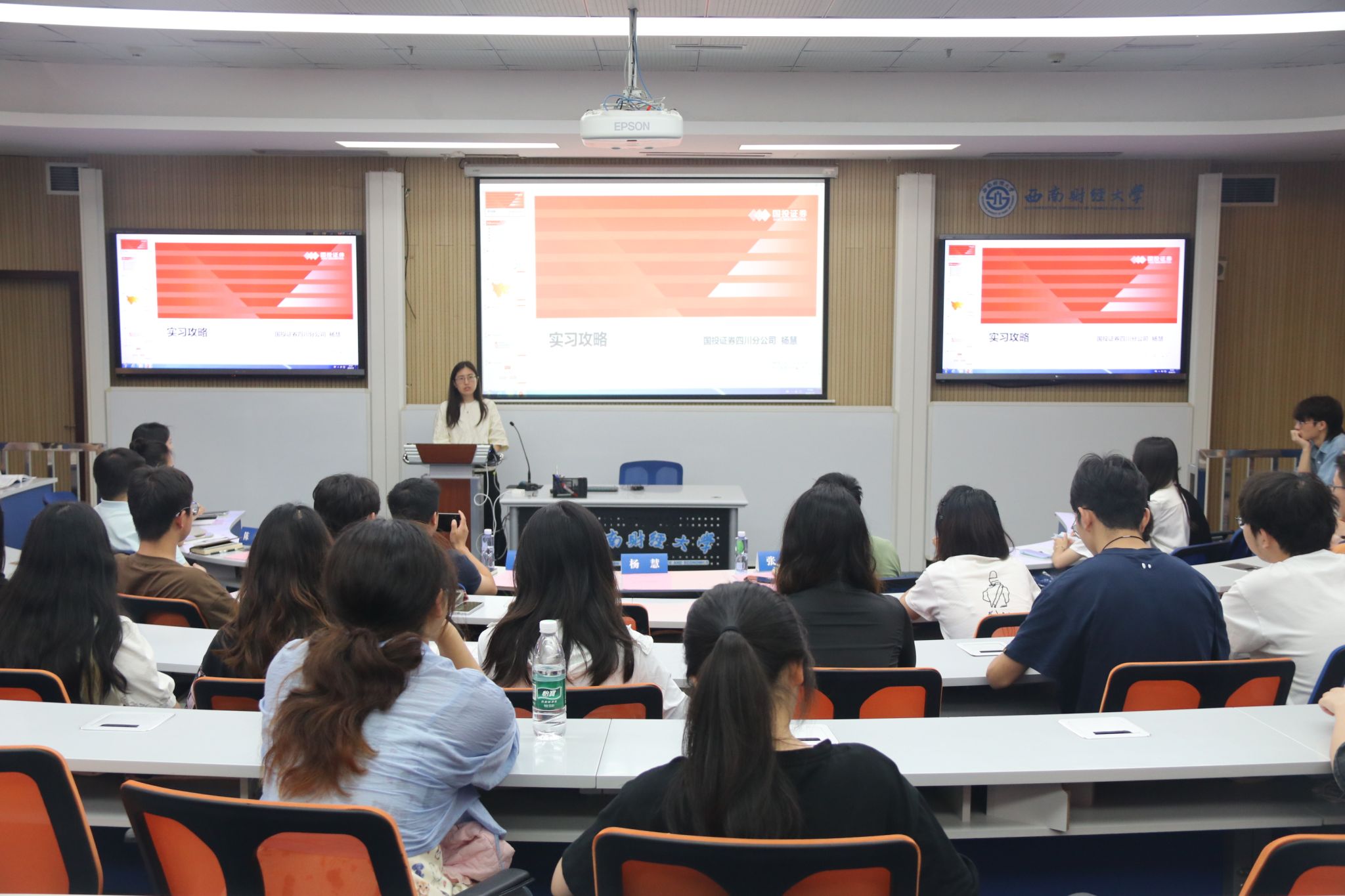 在分享环节,2021级金融学本科生雷雨嫣分享了她在国投证券的实习收获,在帮助同学们了解相关行业实习内容的同时,鼓励同学们要尽早进行职业规划,发掘自我潜能,增强个人实力。2023级金融学类本科生王紫嫣感谢公司(研究院)提供的优质实习平台,她表示,在实习期间将严格遵守实习纪律,勤学勤问,充分展示西财学子的优秀素养,树立金融学子的良好形象。