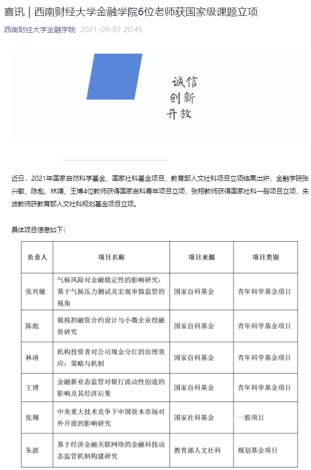 整合一流学术资源,搭建“五位一体”科研大平台。强化海外导师指导平台论文线上交流平台成果孵化作用,优化教师高水平交流交换平台融合作用,深化中国特色金融数据平台支撑作用;持续增强金融风险防范与化解、金融科技与普惠金融、公司金融与资本市场三大科研团队实力,深化科研评价与团队管理机制改革,推动跨学科整合,完善大平台大团队布局。
