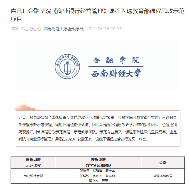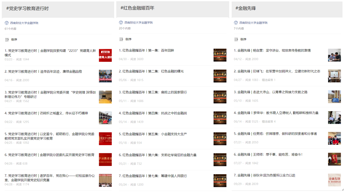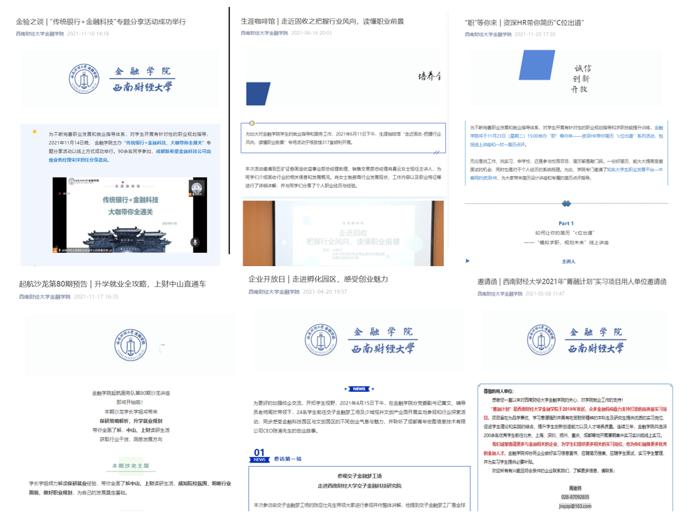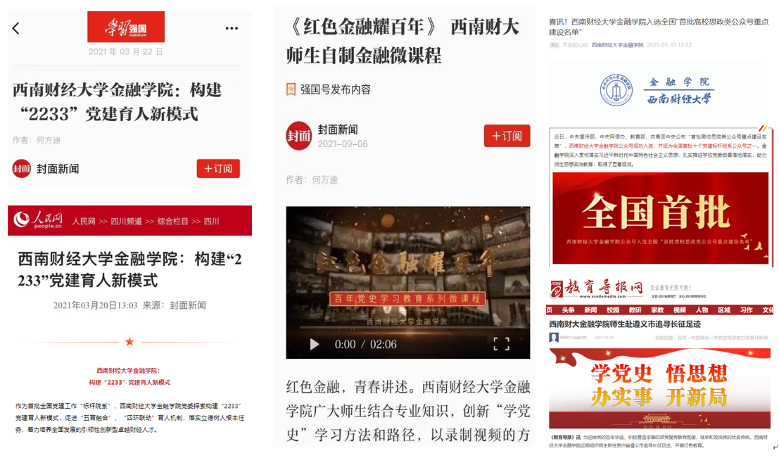 贯通育人渠道,加强阵地建设。公司党委坚持立德树人,创新方式方法,打造贯通课堂教学、文化育人、实践育人的渠道和平台。加强全媒体舆论阵地建设,完善校内网页、公众号、微博、微信群为架构的媒体矩阵。人民网、学习强国等主流媒体对公司党史学习教育相关活动报道近10篇;公司以入选全国“首批高校思政类公众号重点建设名单”为契机,在公众号、主页等推出党史学习教育系列报道近60篇,包括金融先锋、红色金融耀百年等系列。校内外媒体持续发出金融声音,彰显金融力量。