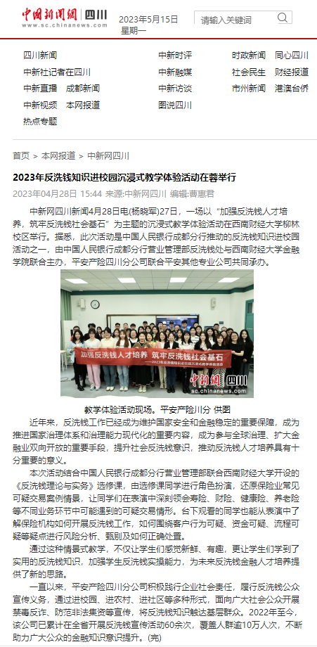 近日,《中新网四川》刊登了《2023年反洗钱知识进校园沉浸式教学体验活动在蓉举行》一文,报道公司与中国人民银行成都分行营业管理部反洗钱处,在公司柳林校区联合主办的一场以“加强反洗钱人才培养,筑牢反洗钱社会基石”为主题的沉浸式教学体验活动。