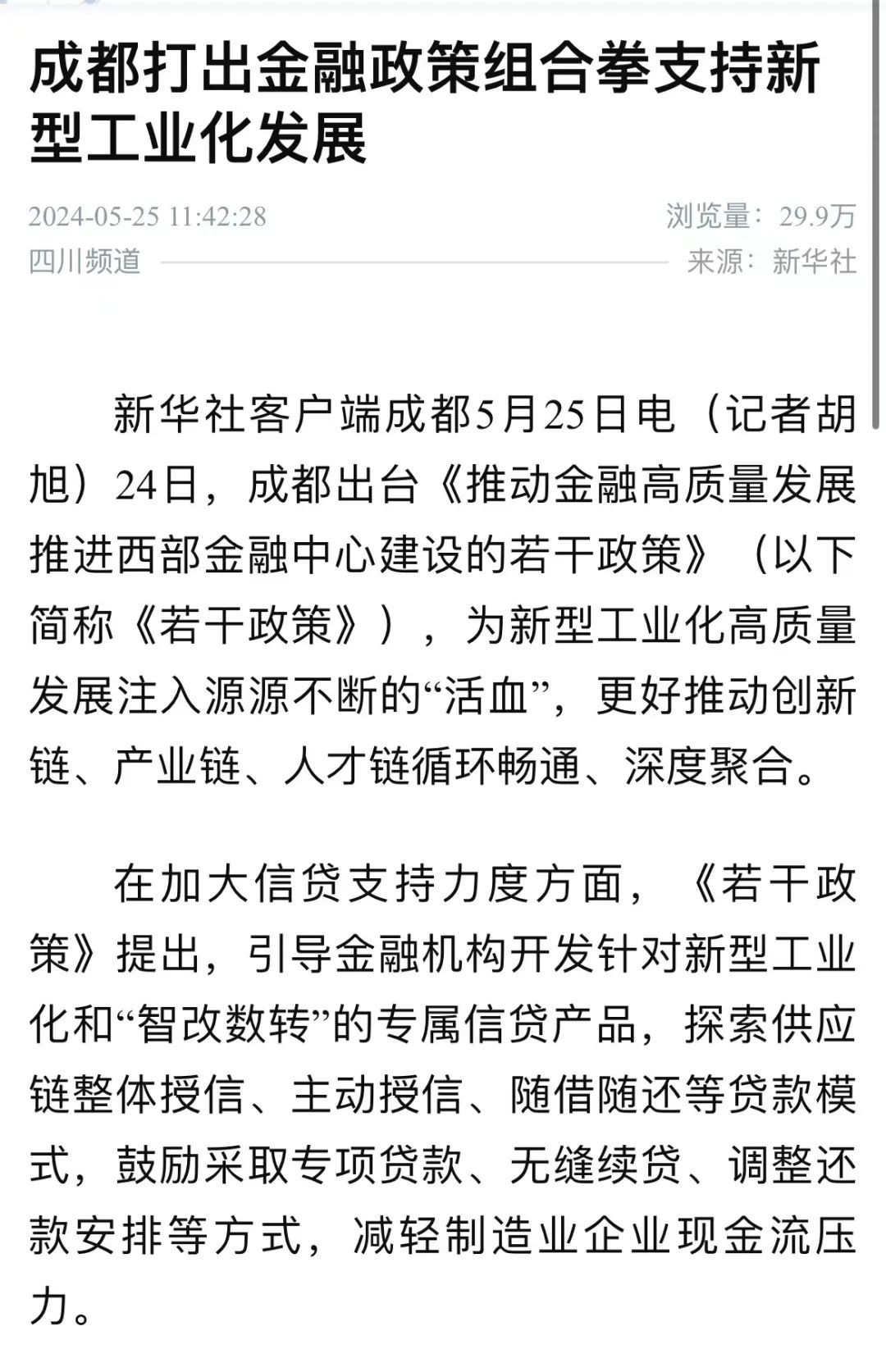 新华社客户端成都5月25日电(记者胡旭)24日,成都出台《推动金融高质量发展 推进西部金融中心建设的若干政策》(以下简称《若干政策》),为新型工业化高质量发展注入源源不断的“活血”,更好推动创新链、产业链、人才链循环畅通、深度聚合。